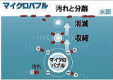 マイナスイオンを帯びたマイクロバブルはプラスイオンを持つ汚れと結びついて浮上しながら水中で消滅し汚れを水面へ浮かび上がらせます