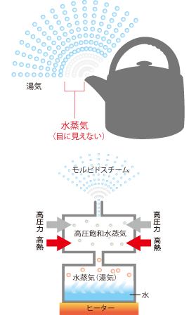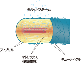 モルビドスチームとは? ![]() やかんで水を沸騰させたときに口から吹き出した直後の目に見えない気体、これが水蒸気です モルビドスチームは、目に見えない気体の水蒸気をさらに加熱した「過熱水蒸気」を使用しています 145度の高熱と3.5気圧の圧力をかけることにより、液体ではなく気体化されたスチーム 湯気の水分子と比較して約10万分の1という極めて小さい分子です @水膨張 ナノレベルのスチームがキューティクルのすき間を通り毛の内部を水分で満たす事によって 内側から膨らませる水膨張をおこないキューティクルを中から開かせます その結果トリートメント成分が内部に浸透しやすくなります またカラーの場合通常は薬液の成分でキューティクルを開かせますが水膨張を利用した場合は その必要がなく短時間で染める事ができ毛にとってもやさしいのです ![]() A潜熱効果 毛髪内部に入り込んだモルビドスチームの微粒子は、それ自体に潜熱を持っています。 その潜熱により、薬剤が活性化し化学反応を促進するため、施術時間の短縮化につながります ※水が水蒸気になる時に熱エネルギーを吸収(吸熱)しています この吸熱した熱エネルギーは水に戻る時に放出されるので毛の内部で薬剤活性を促すのです ![]() B保水効果 超微粒子のモルビドスチームは、傷んでいる毛髪でも隅々まで入り込み、水分を行き渡らせます。 これが結合水となり毛髪内部にとどまります。薬剤を浸透させる前にしっかり水分を補給しておくことで 傷んだ部分を守り、かつ傷んでない部分には余分なダメージを与える事なく美しく保つことが出来ます 2013年9月からの 新しいシャンプー手順 泡シャンプー2度洗い ↓ タオルドライ ↓ モルビドスチーム(水膨張でキューティクルを開かせる) ↓ トリートメント@ ↓ モルビドスチーム(潜熱効果でトリートメント成分をより一層浸透させる) ↓ 洗い流してタオルドライ ↓ トリートメントA (洗い流さないタイプを数種類使い分けます、ドライヤーの熱から毛を守ったり汚れにくくする効果等) ↓ モルビドスチーム(保水効果) ↓ ドライセット 従来のシャンプー手順 泡シャンプー2度洗い ↓ リンス ↓ 洗い流してタオルドライ ↓ ドライセット